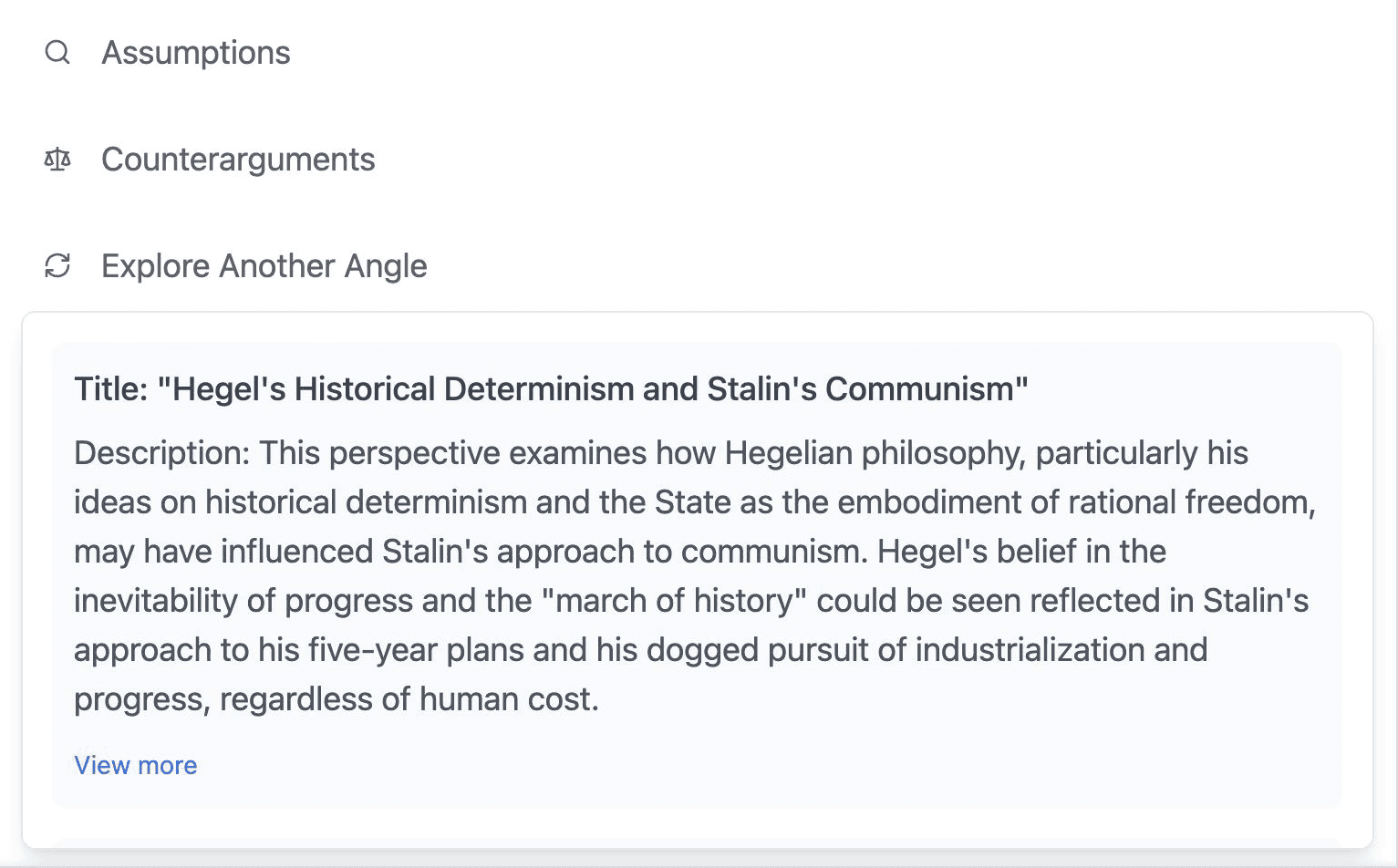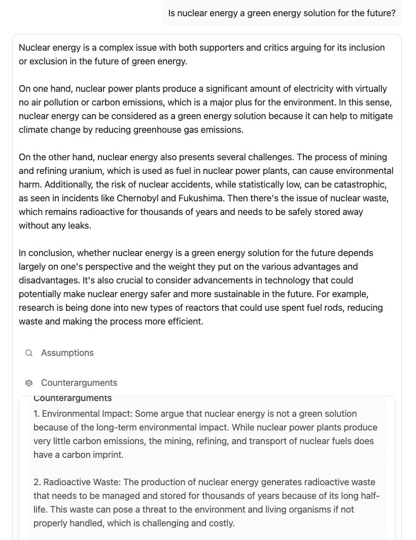 Quick Toggle between alternative perspective, context expansion and original answer allows comprehensive view on the subject inquired