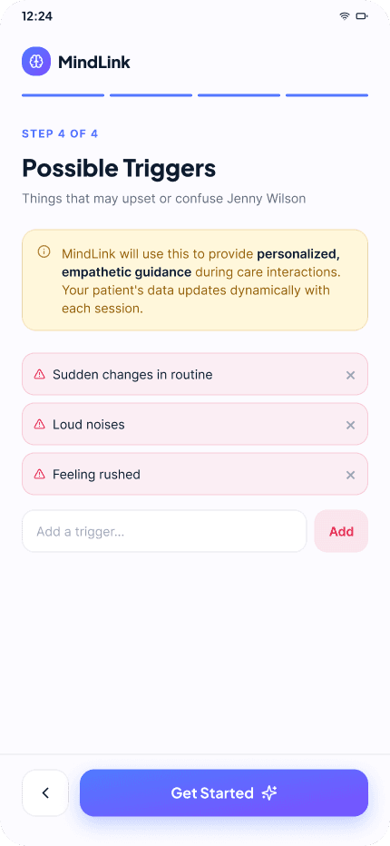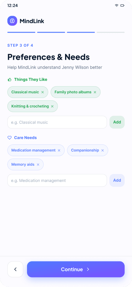 Setting up fundamental patient information can help MindLink develop empathy that generate prompts tailored to the patient’s needs.