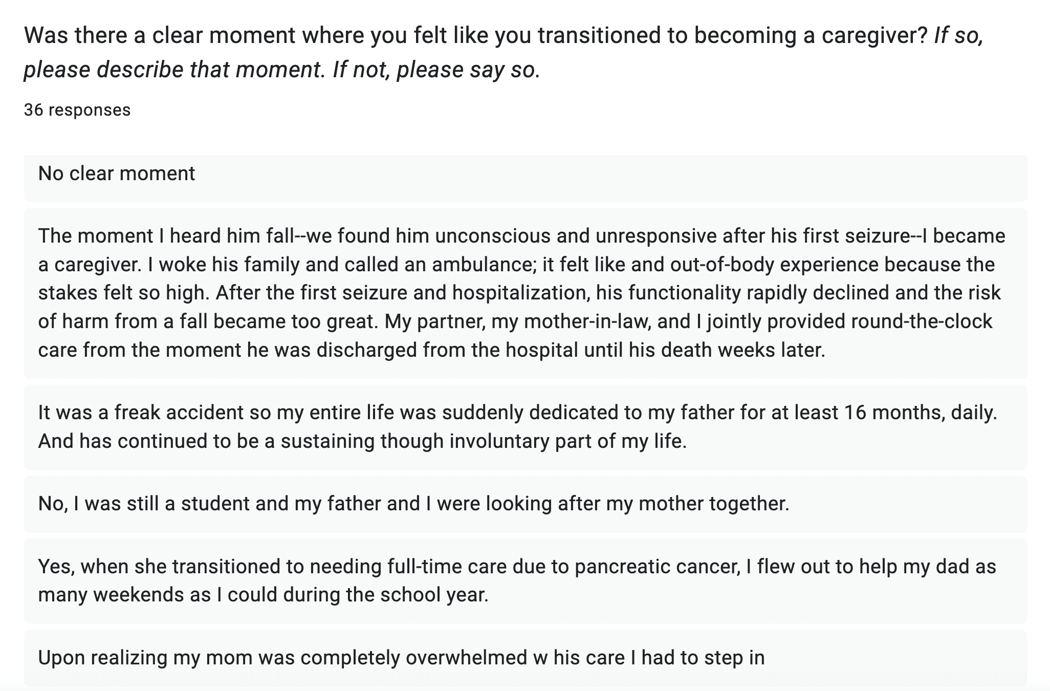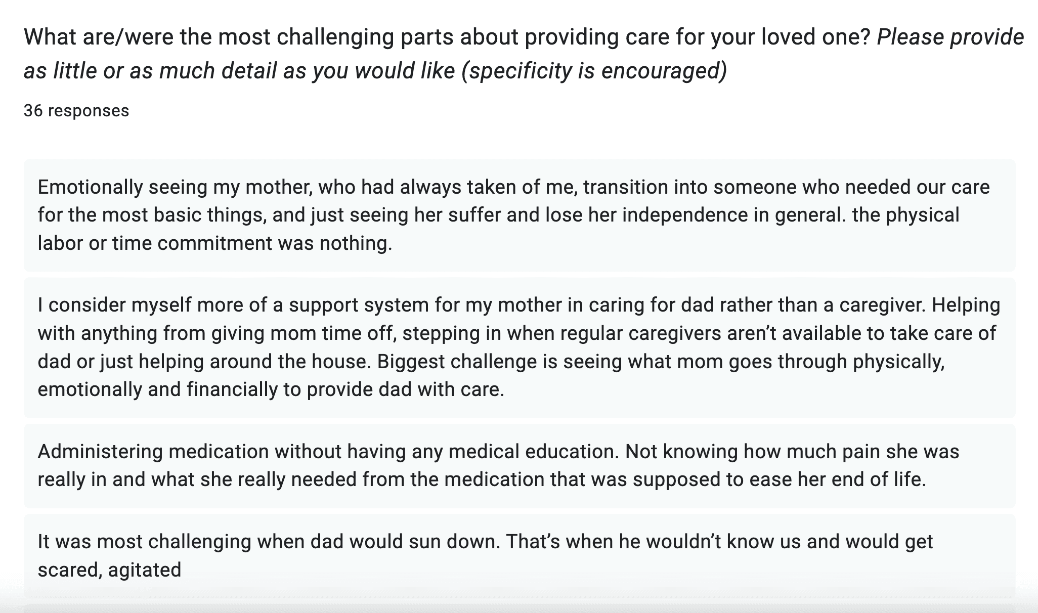 Prior to in-depth one-on-one interviews, we designed a detailed survey questionnaire to provide us with preliminary understanding of the family caregiver profile. We refined our interview guide based on the findings in this survey.